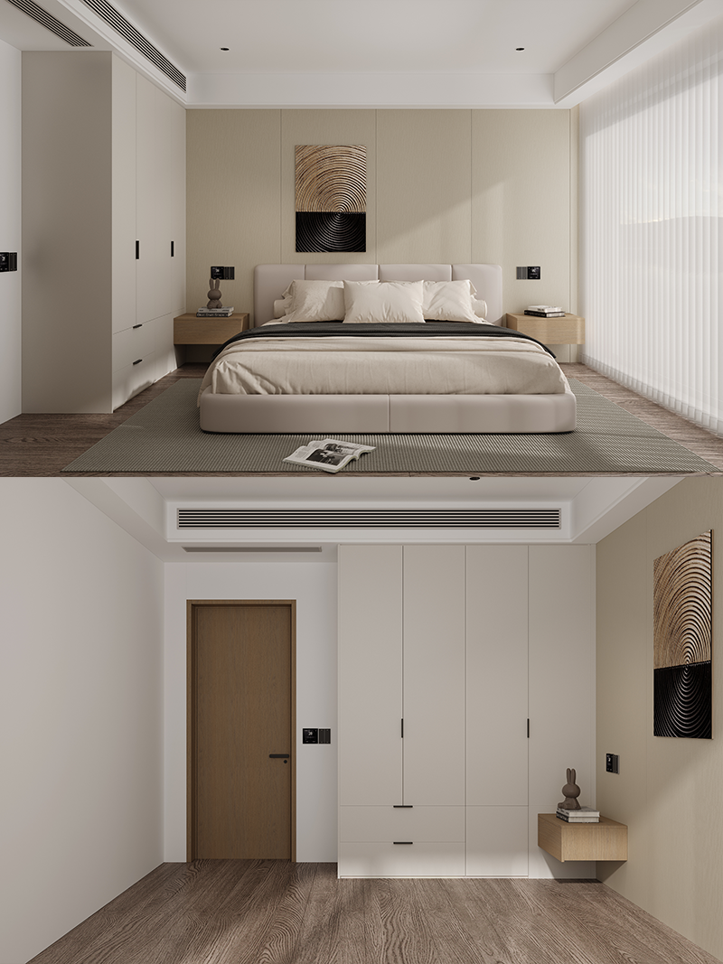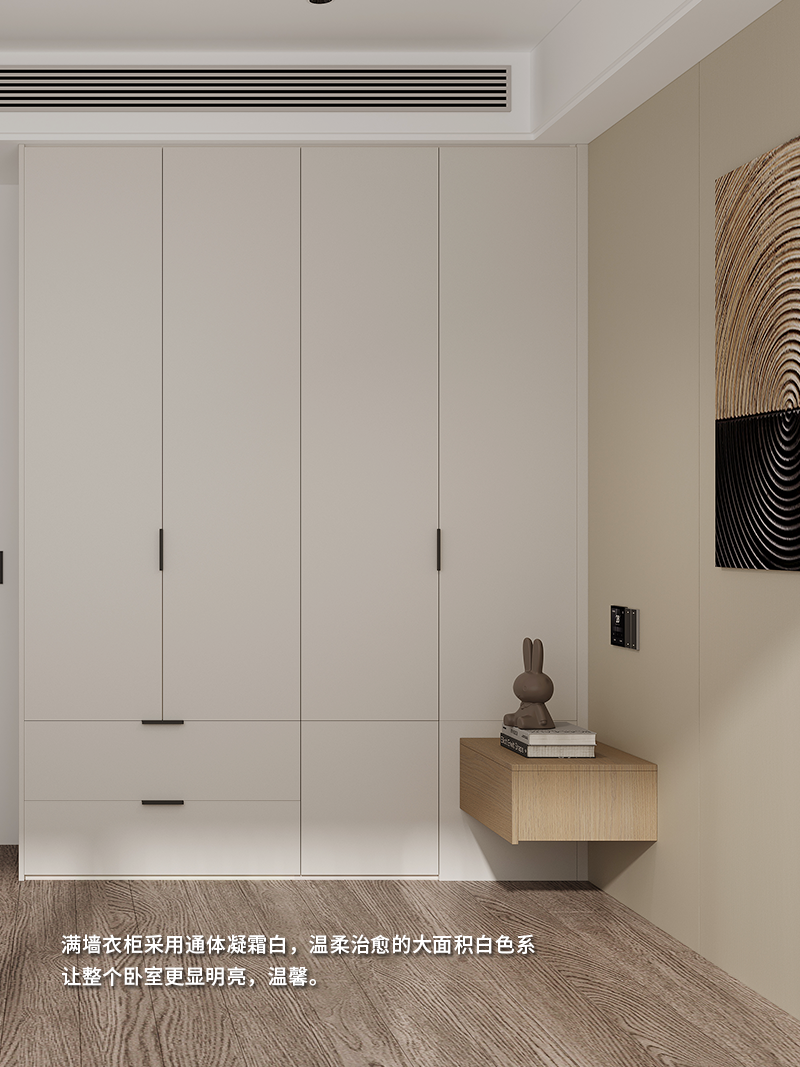 满墙衣柜采用通体凝霜白,温柔治愈的大面积白色系让整个卧室更显明亮,温馨。再以一组卡地亚黄橡床头柜进行点缀,大气自然的高级气息油然而生。